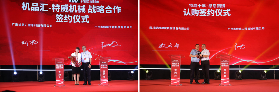 活动现场,工程机械华南区域最具影响力综合服务商——广东机品汇信息科技有限公司以200台意向订单拉开了本次签约活动的序幕,紧接着现场的数百家意向单位踊跃上台,与特威机械进行了认购签约仪式,充分彰显着广大客户对特威机械的认可和信赖。