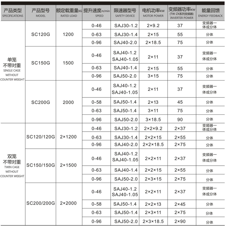 SC SERIES ECO-FRIENDLY ELEVATOR Rated speed: 0-46, 0-58, 0-63, 0-96 m/min Besides the normal features of the inverter hoists, sc series inverter type environmental protection hoists have the following: characteristics the hoists get safe and clean energy back to the internal power grid for equipment use during falling through the energy feedback system. The feedback electrical energy when falling can be 50% of energy consumption when going up.